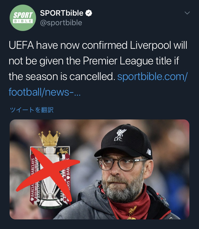 【悲報】リバプールさん、リーグが中止となった場合優勝はお預け