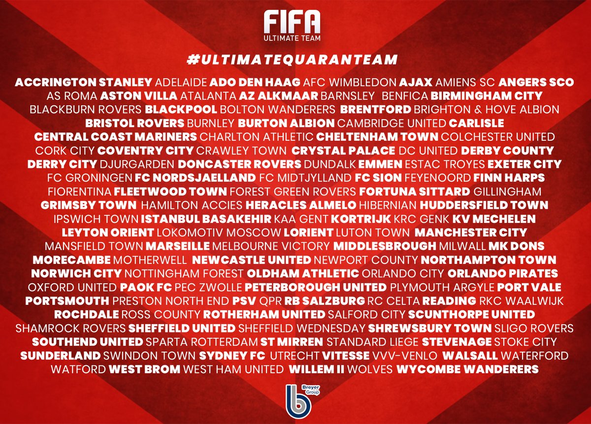 英サッカークラブチーム「レイトン・オリエントFC」は世界128のサッカークラブチームを集め、「Quaran-Team (検疫チーム) 」を結成し、PlayStation 4上でバーチャルのチャリティー大会FIFA20を開催してTwitchで衛星中継することを決めた。このアイデアは新型コロナウイルスのパンデミックが原因で多くの試合もゲームの展示会も中止されたことから生まれた。