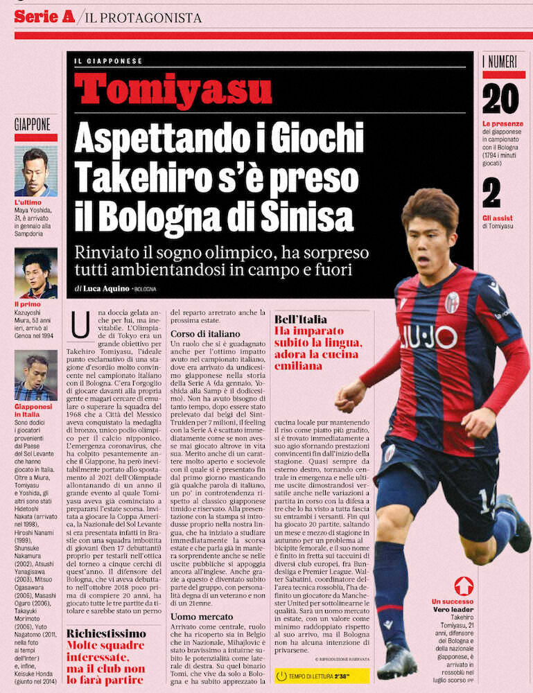 カラー面の1ページを割いて「五輪の夢は延期となったが、冨安は昨年の夏から東京を視野に入れて準備をしていた」と報道。ベルギー1部シントトロイデンから昨夏に完全移籍し、開幕から右サイドバックでレギュラーに定着してリーグ戦20試合に出場して2アシストをマークしており「イタリアサッカーに素晴らしいインパクトを与えた」とセリエA初挑戦での活躍ぶりを高く評価した。
