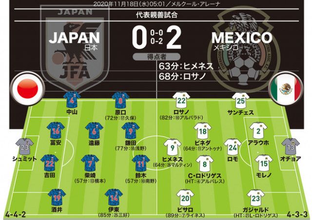 【警告】日本=鈴木(26分)、酒井(39分)、中山(51分)、鎌田(74分) メキシコ=ガジャルド(37分)、ロサーノ(42分)、アントゥナ(84分)【退場】なし【MAN OF THE MATCH】ラウル・ヒメネス(メキシコ)