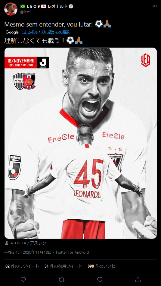 ◆悲報◆浦和FWレオナルド、今度は本人が意味深ツイート!「理解して無くても戦う!」