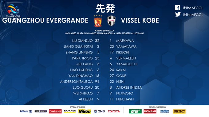 【速報】広州恒大vsヴィッセル神戸のスタメンキターーwww