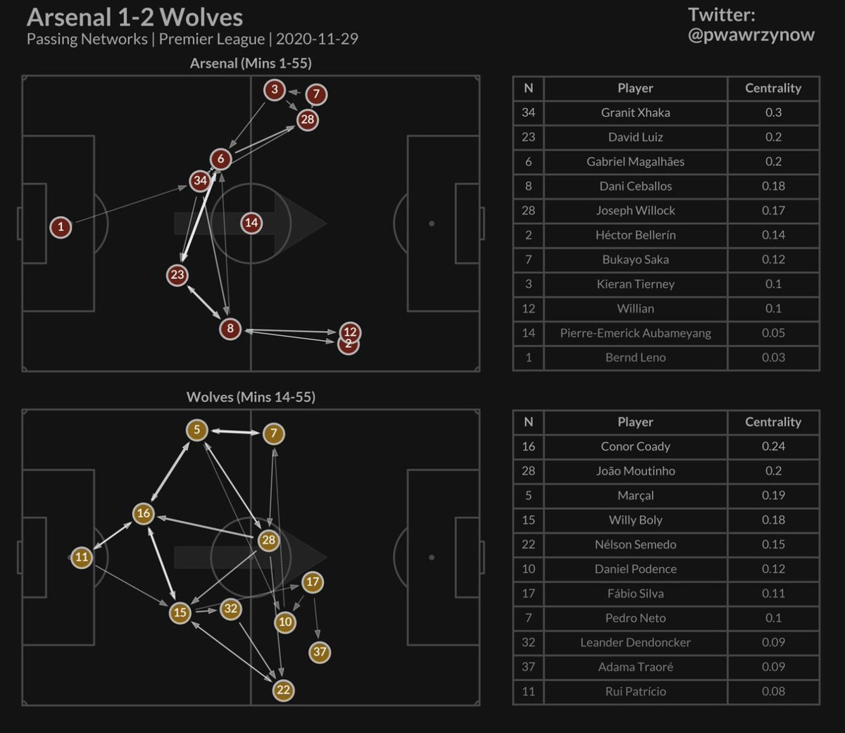 Arsenal’s passing network vs. Wolves’ passing network on Sunday. [@pwawrzynow] pic.twitter.com/9R4QIV3HVU