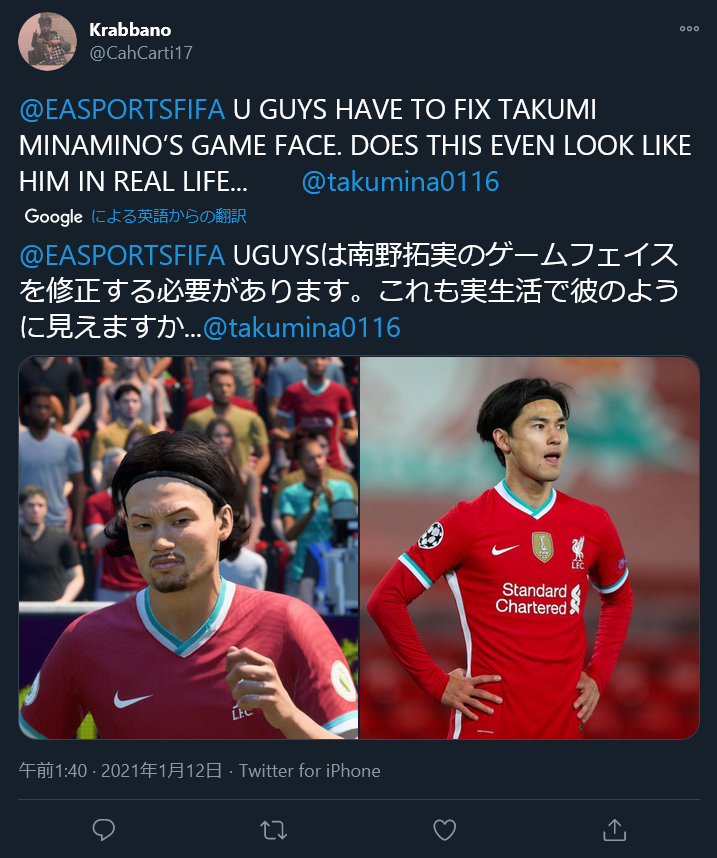 【悲報】FIFA20南野タキの固有フェイスが酷すぎるとイギリスでも話題にwwww