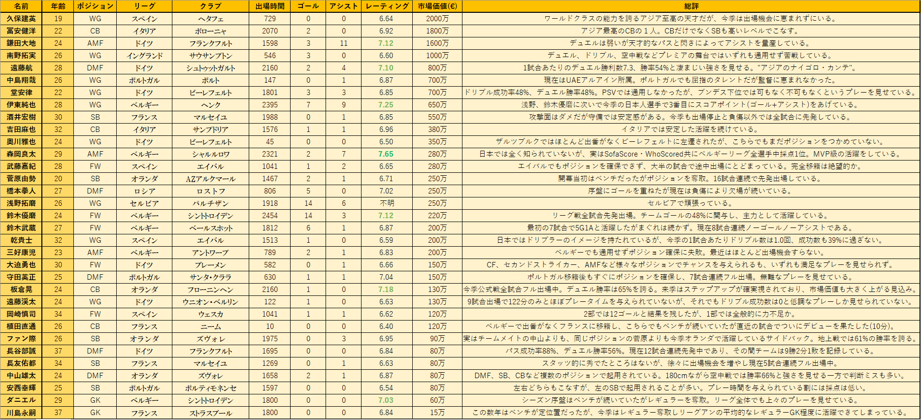 今シーズンのサッカー海外組の活躍度一覧がこちらwww