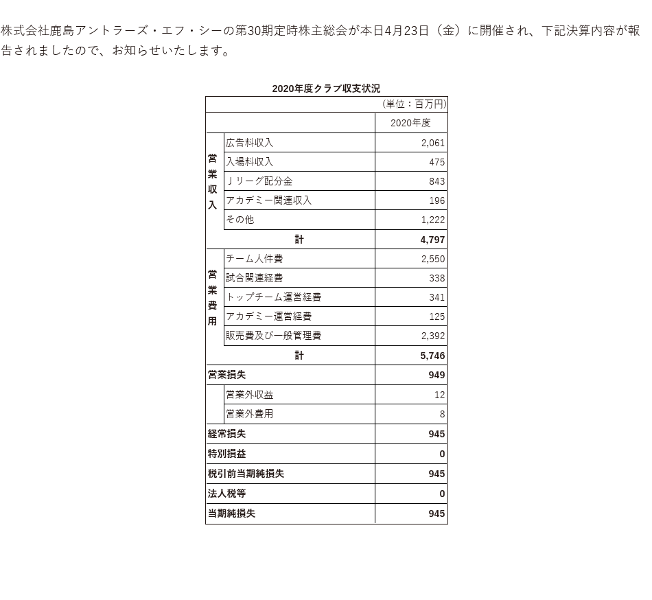 ◆悲報◆鹿島アントラーズ2020年決算売上20億減赤字9.5億円…コロナ禍で