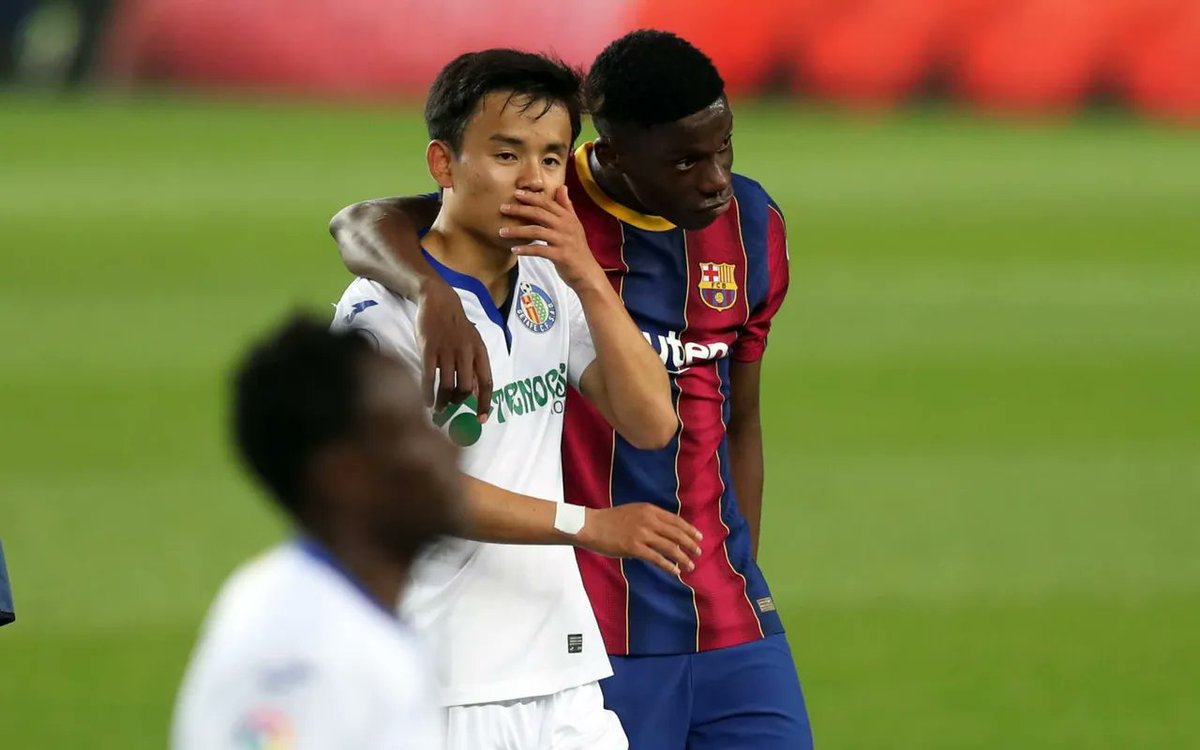 ◆画像◆カンプ・ノウでバルサMFモリバと肩を組んで何やら話す久保建英