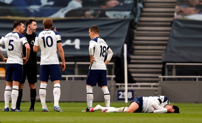 ▲倒れ込んだソン・フンミン(右)。トッテナムの選手たちはレフェリーに詰め寄り、レビューが行なわれた。(C)Getty Images(関連動画参照)