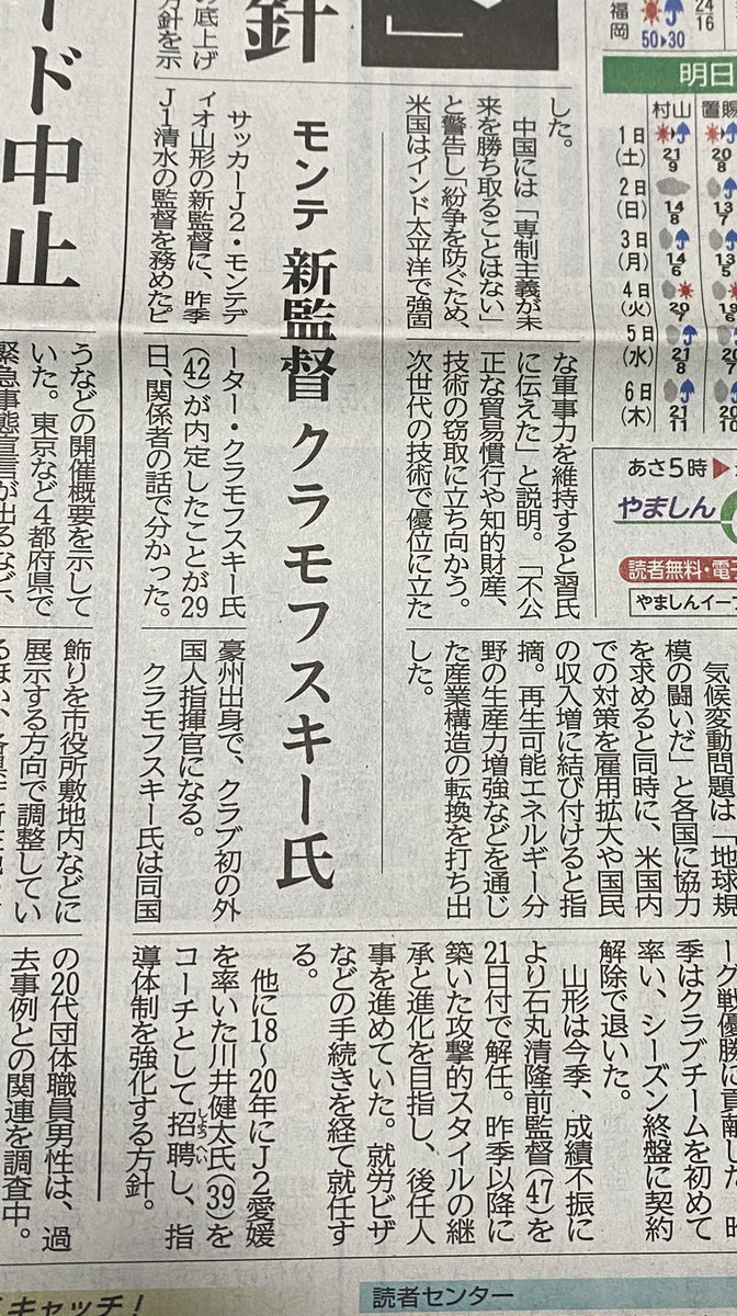 ◆J2◆モンテディオ山形、新監督にモフモフでおなじみクラモフスキー氏内定!