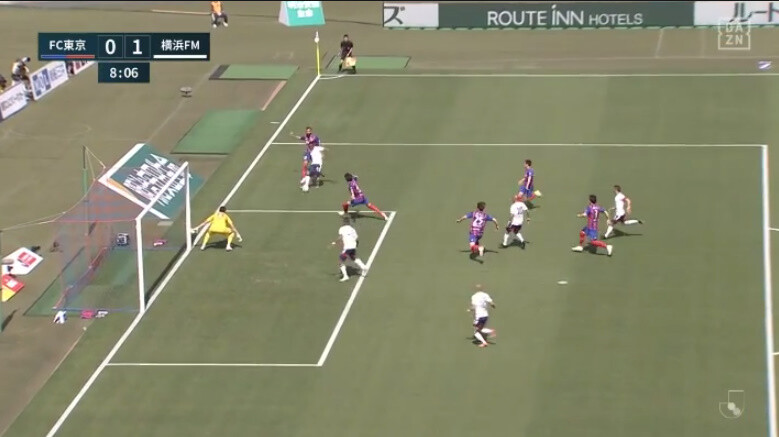 ◆画像◆ゴール正面でオナイウと大自然の二人がドフリー、横浜FM先制時のFC東京DFのポジショニングの悪さは異常