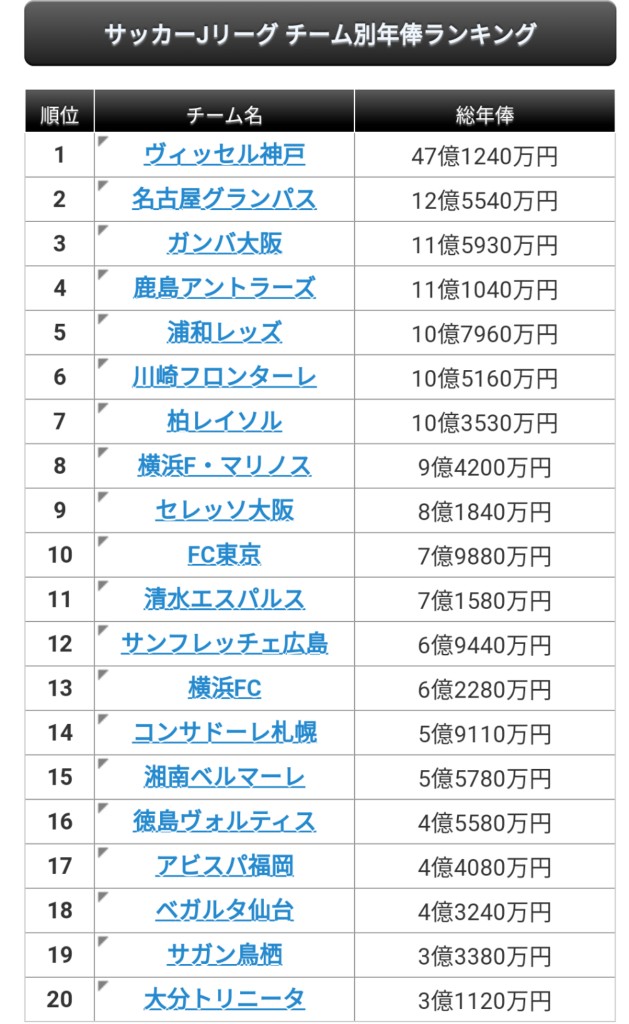 【悲報】Jリーグさん…チーム別年棒ランキングwwwwww