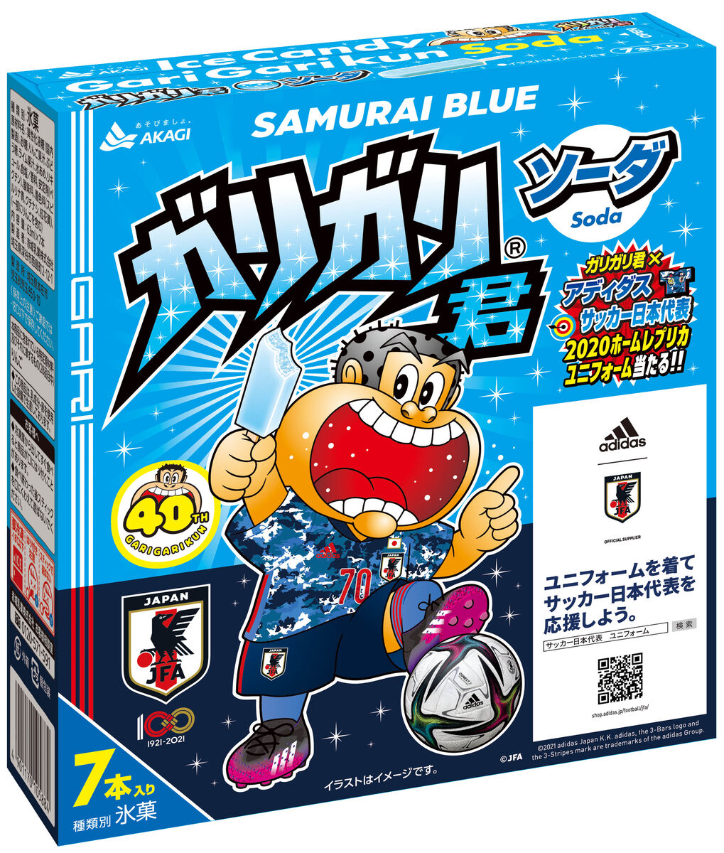 7本入り「マルチ ガリガリ君ソーダ サッカー日本代表ver.」では、抽選で合計1000人に「ガリガリ君×アディダス サッカー日本代表 2020ホームレプリカユニホーム」が当たるキャンペーンを実施。右胸にガリガリ君40周年ロゴマークをあしらった、2021年限定の賞品となっている。背面には「GARI GARI KUN」のネーム。背番号はガリガリ君の希望小売価格(税別)にちなんで「70」。