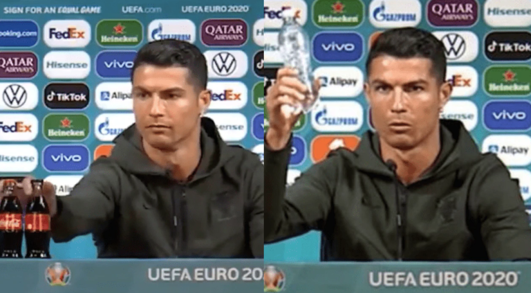 C・ロナウドは15日に控える欧州選手権(EURO2020)のグループF第1節・ハンガリー戦に向けた前日会見に、フェルナンド・サントス監督とともに出席。会見の開始前、目の前に置かれたコカ・コーラのペットボトル2本をじっと見つめると、それを取り上げて脇に押しのけ、残った水のペットボトルを掲げて「アグア(ポルトガルで水の意)」と宣言した。コカ・コーラは大会公式スポンサーの1つ。この大胆行動に対し、指揮官も思わず二度見していた。
