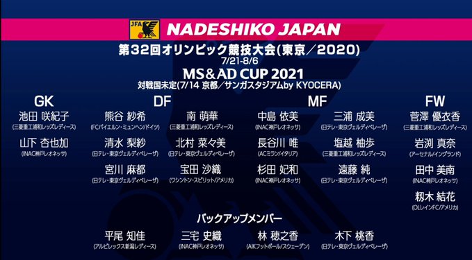 日本サッカー協会(JFA)は18日、来月の『第32回オリンピック競技大会』および『MS&ADカップ2021』へ臨むなでしこジャパン(サッカー日本女子代表)のメンバーを発表した。
