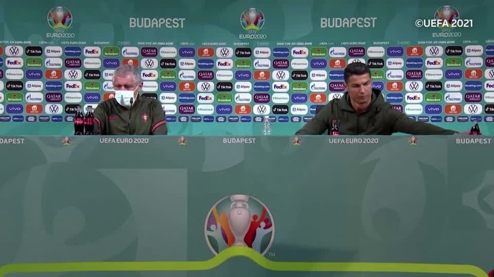 サッカーのユーロ2020に出場しているポルトガル代表のクリスティアノ・ロナルドが、6月14日の記者会見で席上に置かれていたコカ・コーラのボトルを脇にどけ、代わりに水を飲むように呼び掛けた。