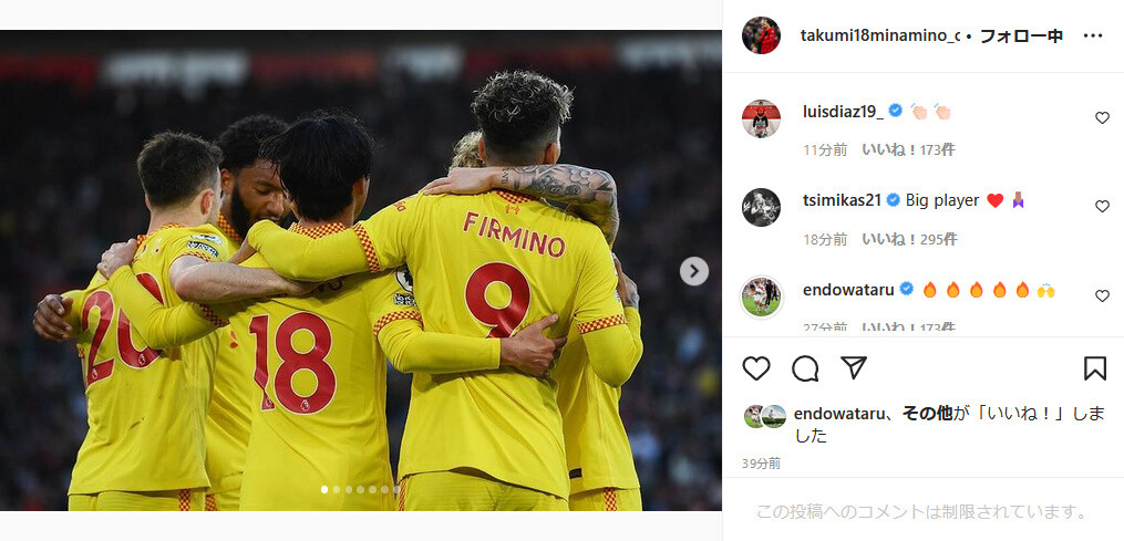 ◆朗報◆殊勲の同点ゴール!南野タキ、インスタ更新してディアスとツィミカスに※貰う😁