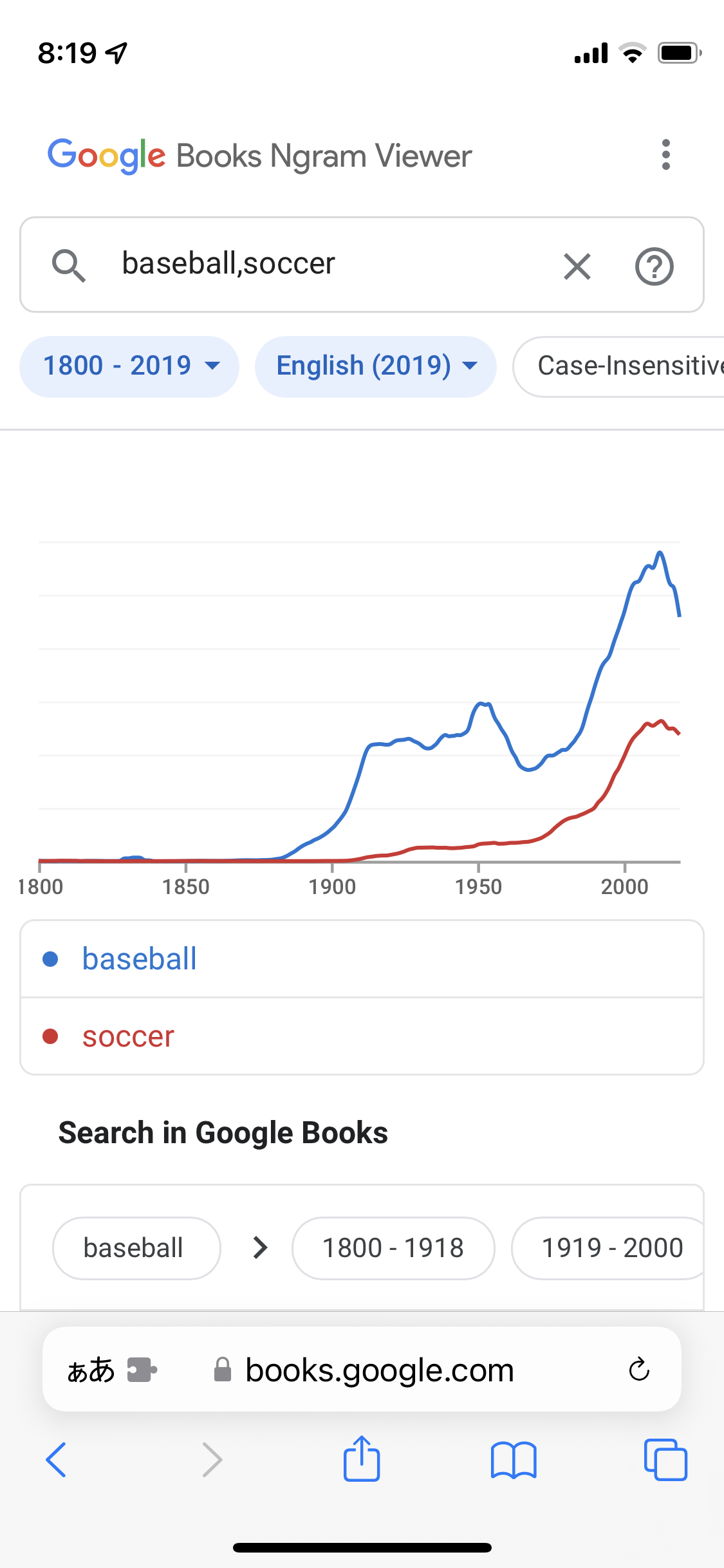 過去200年の文献の中でsoccerと baseballが登場した数はここまで違う