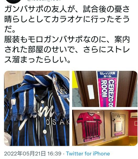 【画像】ガンバサポ、試合後の憂さ晴らしでカラオケに行くもセレッソ大阪ルームになってしまう