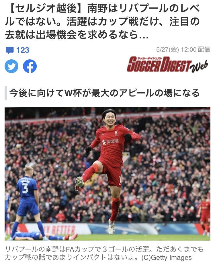 ◆悲報◆セルジオ越後が南野タキを酷評「リバプールのレベルではない、カップ戦だけ」