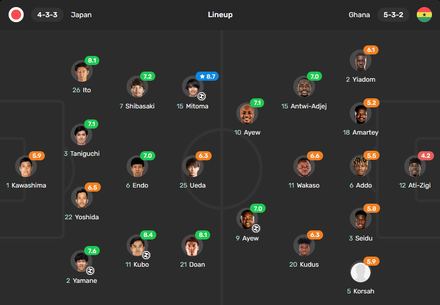 ◆キリン杯◆ガーナ戦採点 MOM三笘8.7,次点久保8.4、堂安・伊藤も8.1と高評価…最低点5.9で川島