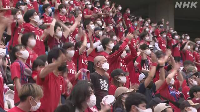 サッカーのJリーグは、新型コロナウイルスへの飛まつ感染のおそれがあるとして、おととし2月以降、スタジアムで声を出して応援することを禁止してきましたが、政府の基本的対処方針で会場の収容率を50%とすれば大声を出してのイベントを実施することが認められたことから段階的に再開していくことを先月決めました。