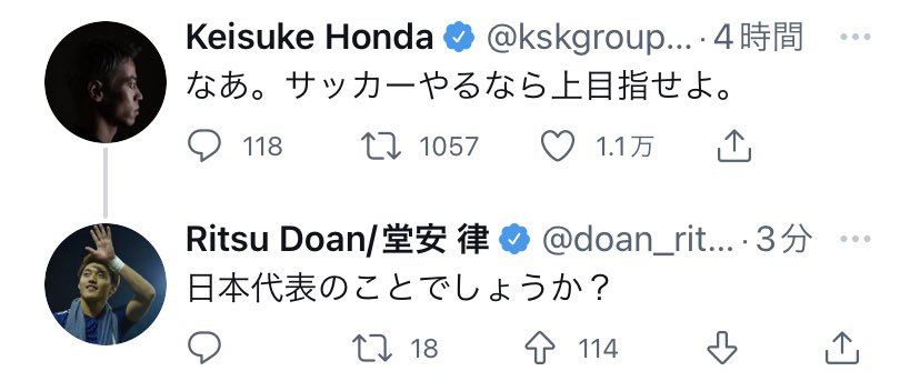 【サッカー】本田圭佑「サッカーやるなら上目指せよ」投稿に、堂安律が「日本代表のことでしょうか?」と返信