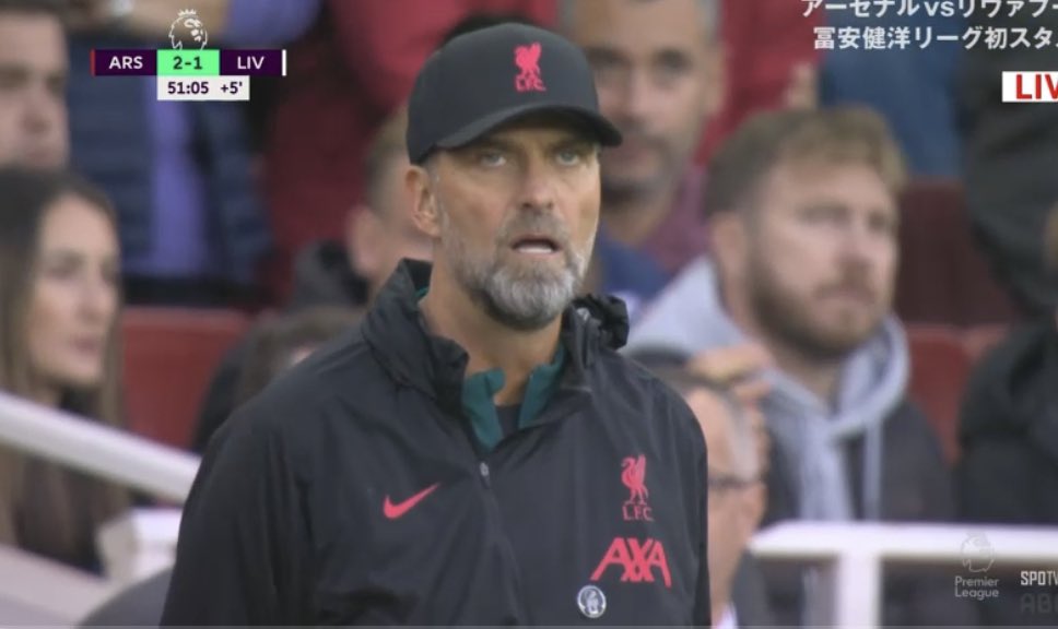 【悲報】クロップ監督…アーセナル戦で点を決められた時の表情wwwwwwwww