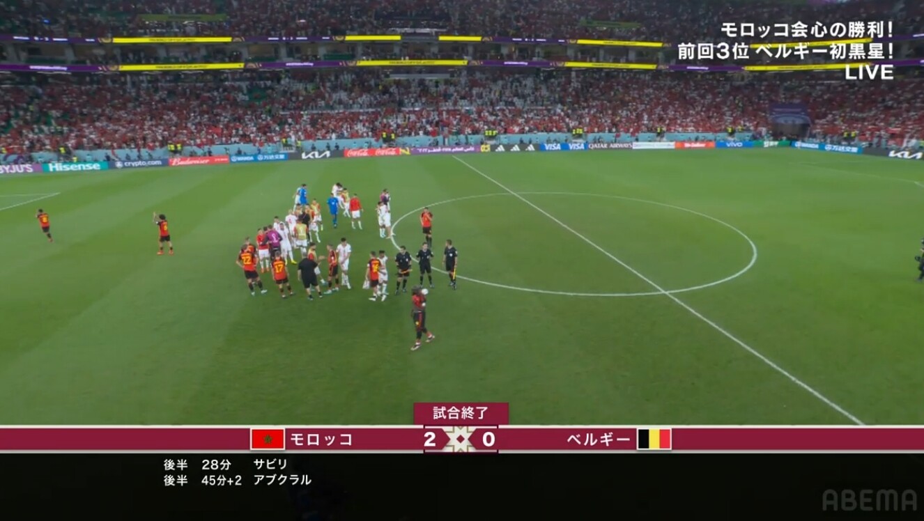 アディショナルタイムの5分間でも猛攻を仕掛けるベルギーだが、ルカクの高さを使ったパワープレーもことごとくモロッコが集中した守備で跳ね返す。すると逆にカウンターの機会が増えたモロッコは、エリア内右に侵入したシイェシュの折り返しをアブフラルがダイレクトで合わせてGKクルトワを破り、勝利を決定付けるダメ押しゴールを奪う。