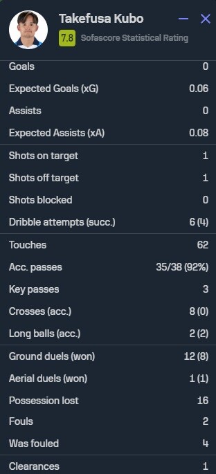 ◆リーガ◆15節 オサスナ戦ソシエダFW久保建英GAなしも7.8で両チーム最高点、キーパス3・デュエル8/12、ドリブル4/6