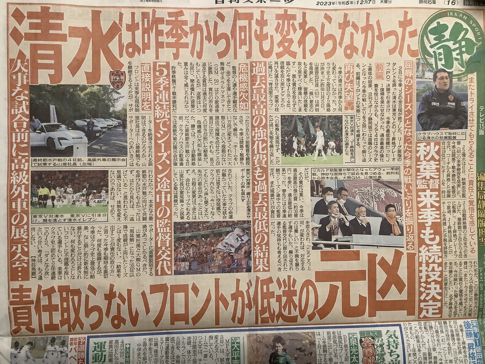 ◆悲報◆スポ新静岡版の清水エスパルス昇格失敗総括記事が辛辣すぎると話題に!「責任取らないフロントが低迷の元凶」
