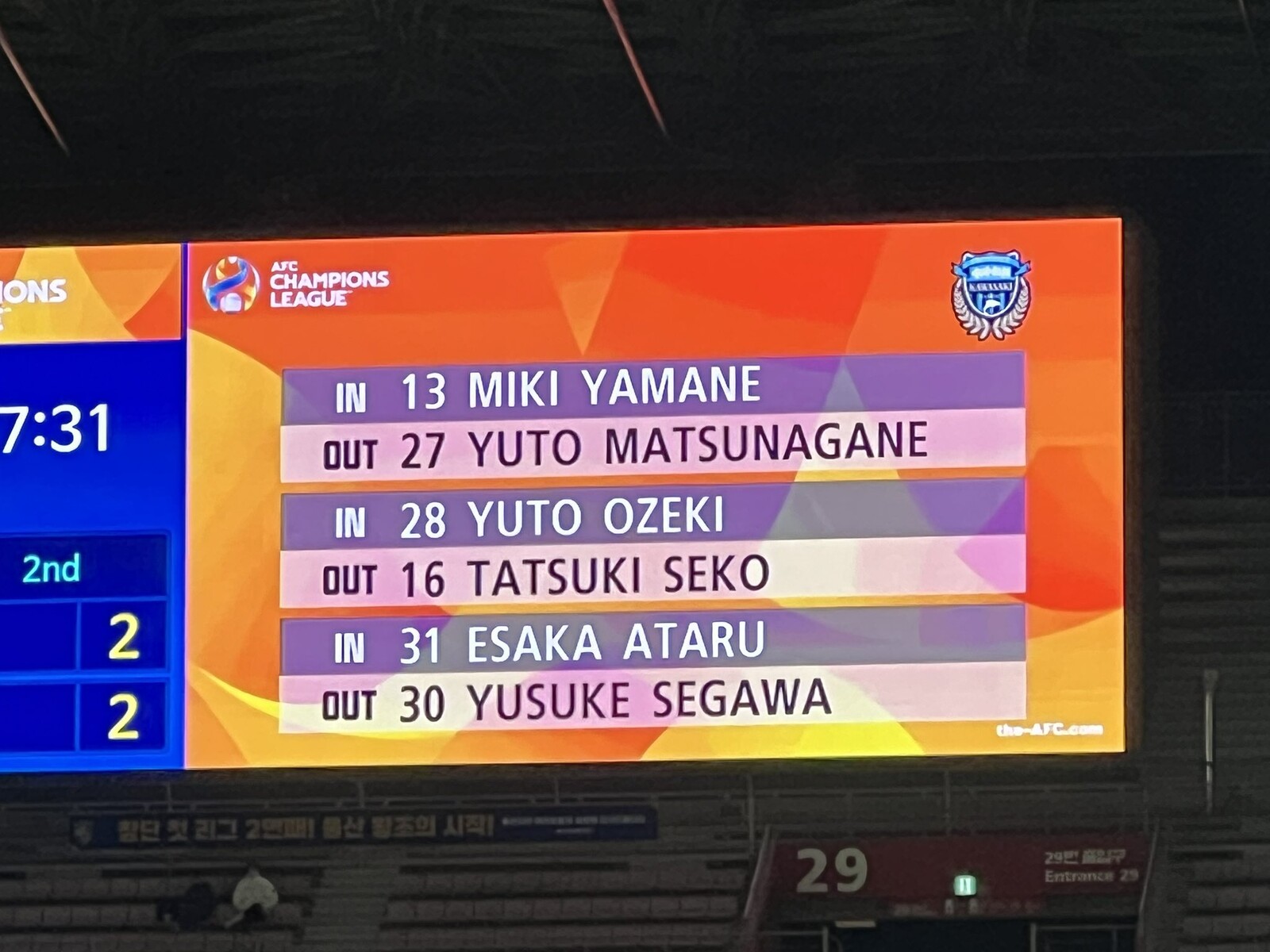 ◆ACL珍◆蔚山現代MF江坂任が川崎Fの瀬川と交代してて🌿