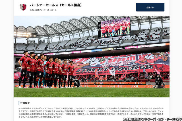 〈【リモート可】営業戦略/年収:800万~1200万円〉そんな見出しの求人広告を出したのは、サッカーJ1鹿島を運営する株式会社鹿島アントラーズ・エフ・シーである。最大値とはいえ「1200万円」とは思い切った値付けではないか。