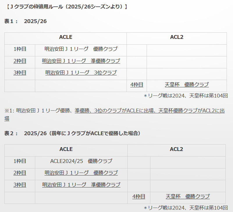 ⇒2025/26シーズンAFCクラブ競技会の出場枠について(修正版)(J公式)