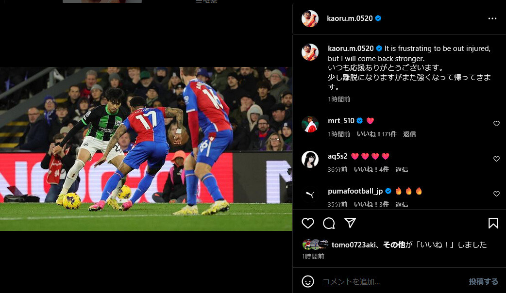 ◆悲報◆ブライトンFW三笘薫、パレス戦の負傷でチーム離脱期間不明、本人がSNSで報告