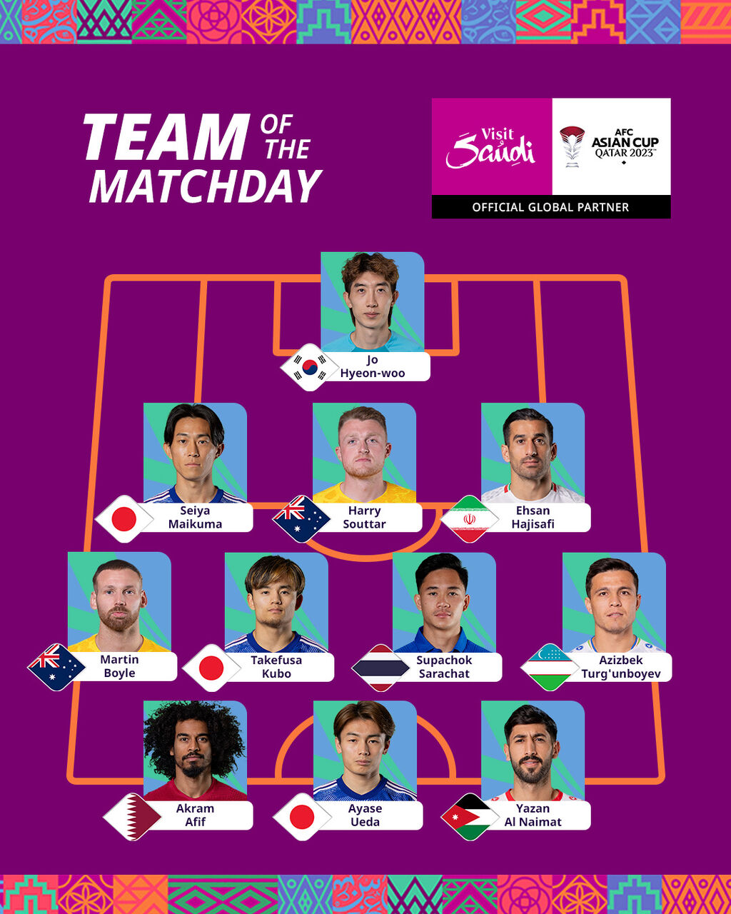 【朗報】AFCアジア杯ラウンド16のベストイレブンが発表!毎熊、久保、上田が選出!