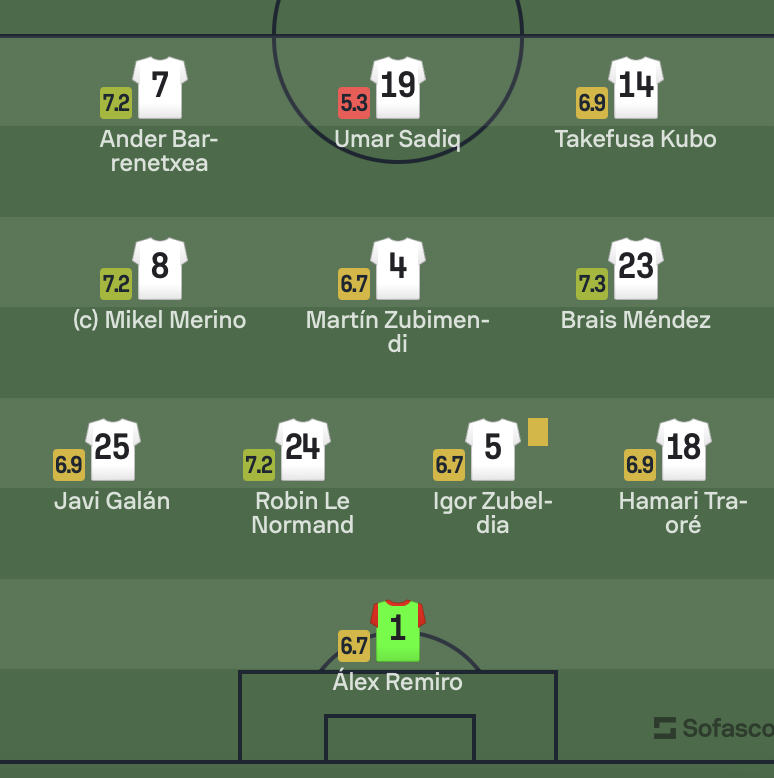 ◆悲報◆ソシエダFWサディクさん、稀に見るビッグチャンスミス4!5.3と退場したかのような採点😭
