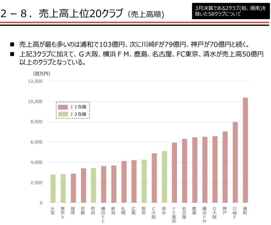 その売上高成長率が最も高いのが藤枝MYFCの99%で、FC町田ゼルビアの78%と下部カテゴリーからの昇格が関係したクラブが並んだ。また、会計的な増加が最も多かったのは浦和の約22億5700万円だった。