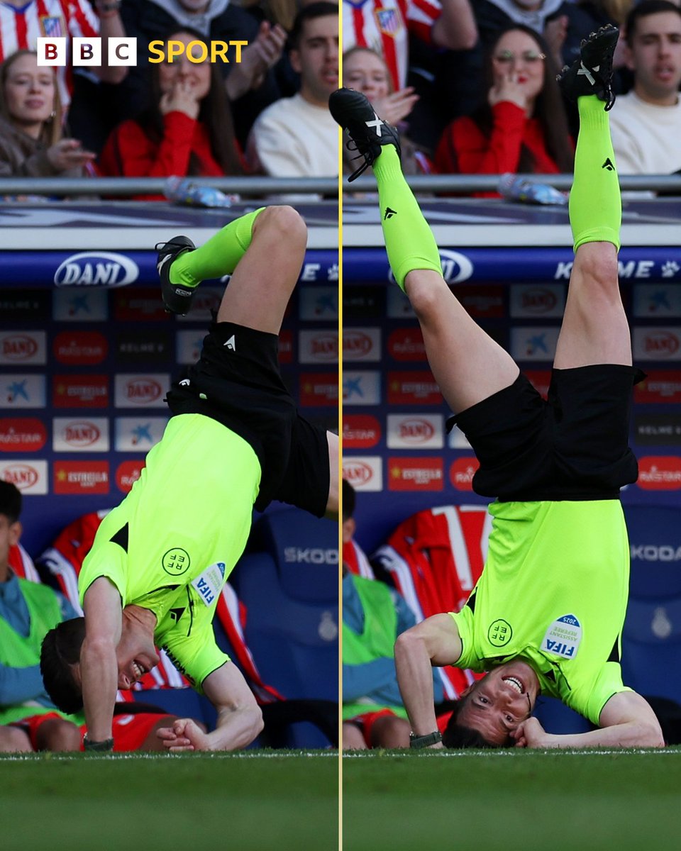 ◆悲報◆リーガの副審さん、シメオネの眼の前で三点倒立をしてしまいめちゃくちゃいい表情になってしまう😂
