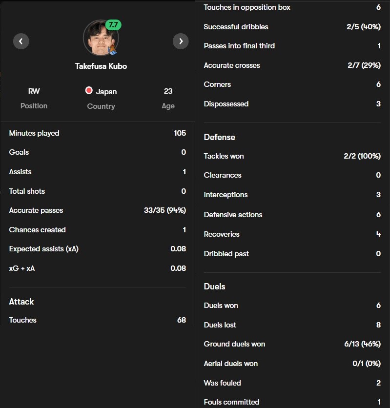 ◆リーガ◆ジローナ戦の久保建英、敗戦もチーム最高点7.9、デュエル9/10・ドリブル4/4と驚異的な数値、守備スタッツも異常