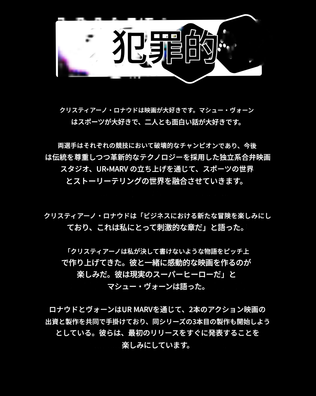 映画を愛するロナウドは、「私にとって非常にワクワクする新章であり、ビジネスにおける新たな挑戦を見据えています」と声明でコメント。また、スポーツが大好きなヴォーン監督は「クリスティアーノはピッチ上で、私が脚本に書くことすらできないような物語を生み出してきました。彼と共にインスピレーションを与える映画を作っていけることが楽しみです。彼はまさに、現実世界のスーパーヒーローです」と期待を寄せている。