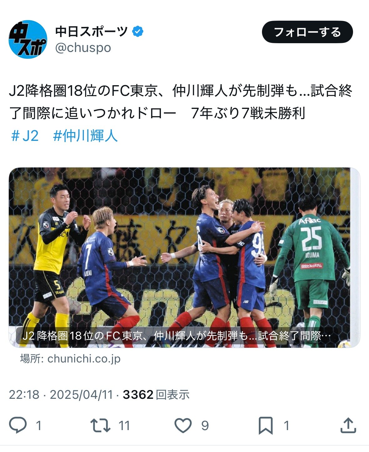 ◆悲報◆柏戦終了間際に追いつかれ17位のFC東京さん、中日スポーツに#で煽られる「#J2」😭