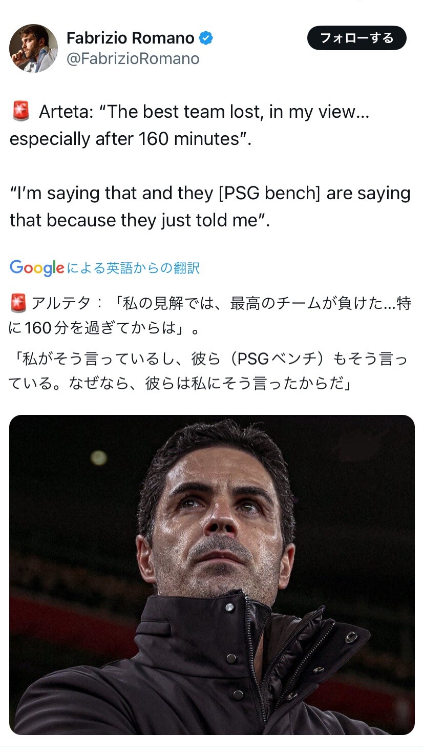 ◆悲報◆アーセナル指揮官アルテタ「ベストチームが敗れた、PSGからもそう言われたよ」と発言してルイス・エンリケに即座に否定されてしまう😭