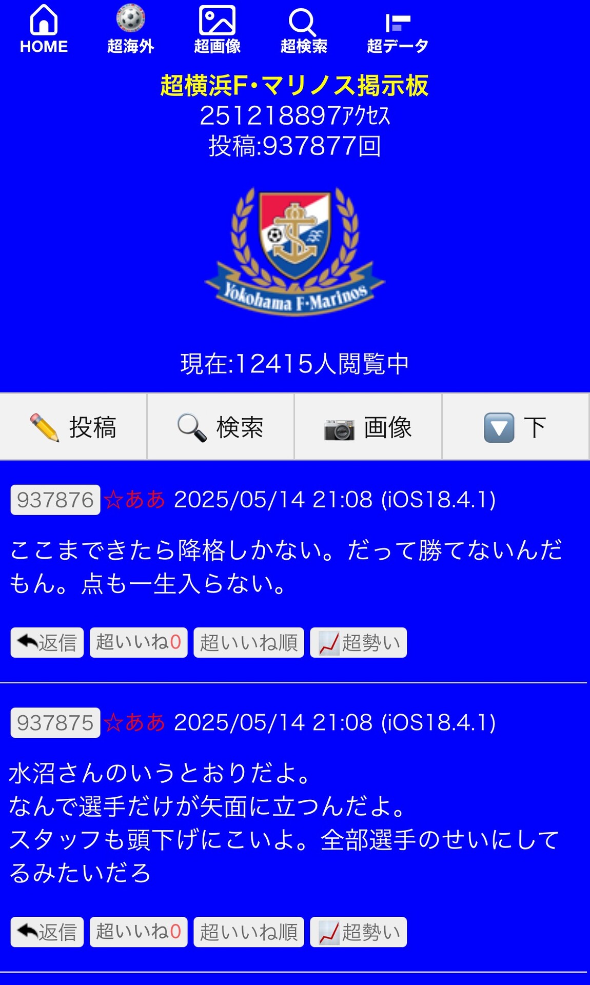 ◆悲報◆横浜Fマリノス×柏レイソル、スタジアムに1万4千人、超板マリノススレに1万2千人🤔