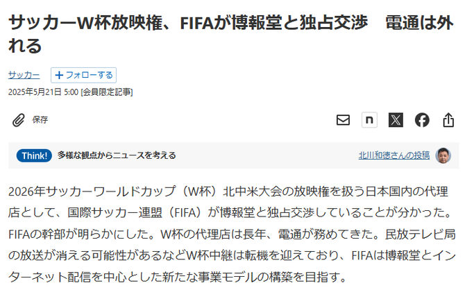 【速報】サッカーW杯放映権、FIFAが博報堂と独占交渉…電通は外れる