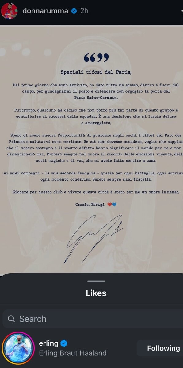 ◆リーグ・アン◆パリ・サンジェルマンGKドンナルンマ、SNSで退団宣言!さっそくハーランドがいいね!🤔