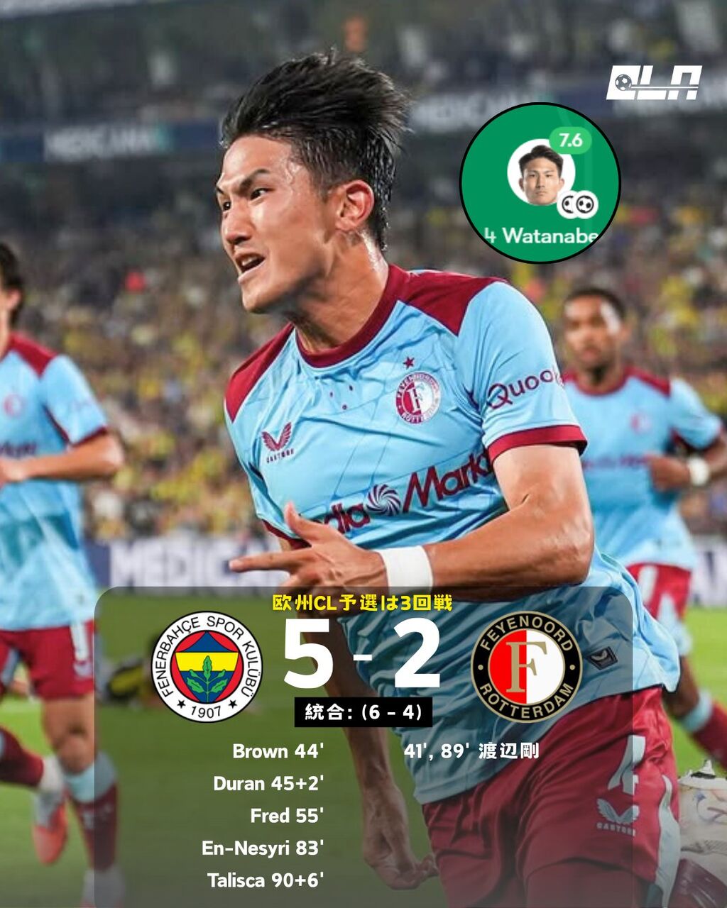しかしその後、後半アディショナルタイムにフェネルバフチェのタリスカがリードを取り戻す得点を挙げて試合終了。渡辺が2得点を挙げたものの、フェイエノールトは2-5で敗れ、2試合合計4-6でフェネルバフチェに敗れてCL本戦出場はならず。同クラブは今シーズンのヨーロッパリーグに回ることが決定した。