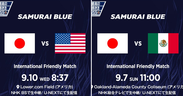 JFAによると、メキシコ代表戦は『NHK総合テレビ』にて生中継、および『U-NEXT』にてリアルタイム配信/見逃し配信されることに。またアメリカ代表戦は、『NHK BS』にて生中継、および『U-NEXT』にてリアルタイム配信/見逃し配信されることになるようだ。