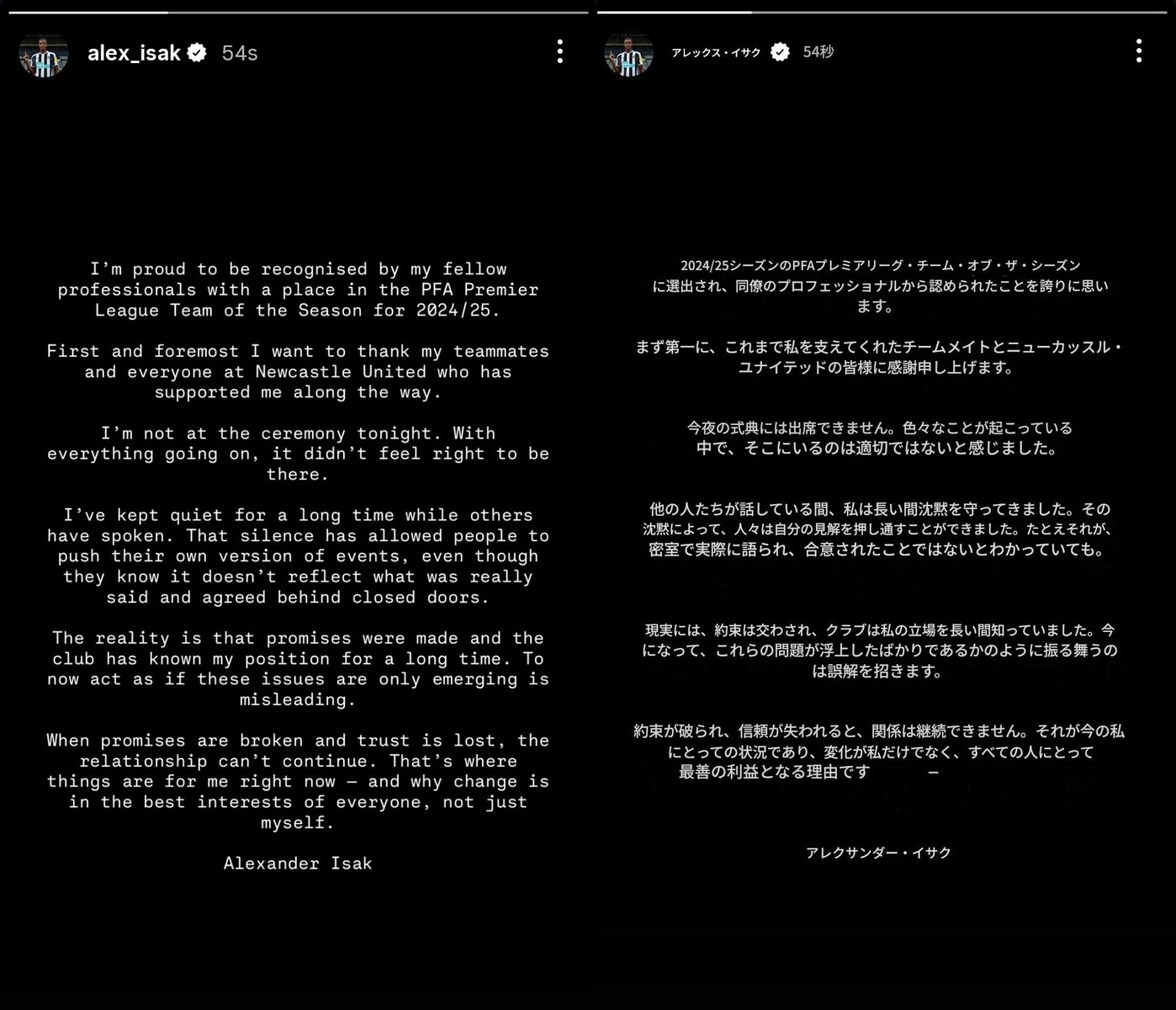 ◆悲報◆練習ボイコット中のニューカッスルFWイサクが緊急声明!「約束は交わされた…信頼が失われると関係は継続できない」