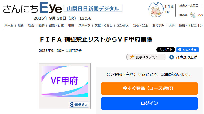 ◆朗報◆FIFAが入金を確認したヴァンフォーレ甲府、補強禁止リストから削除