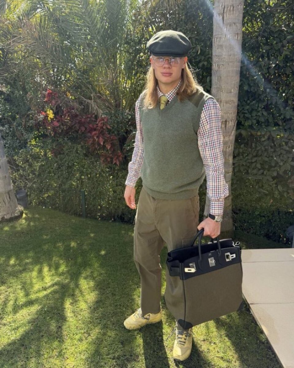 ハーランドは緑のベスト、スラックス、シャツ、ハンチング棒、それにバッグを抱え、なぜか真顔で撮影した1枚を自身のInstagramに投稿。英『Daily Mail』は「社会科の先生みたい」と表現していて、確かにこのショットでは恐怖の点取り屋には見えないか。